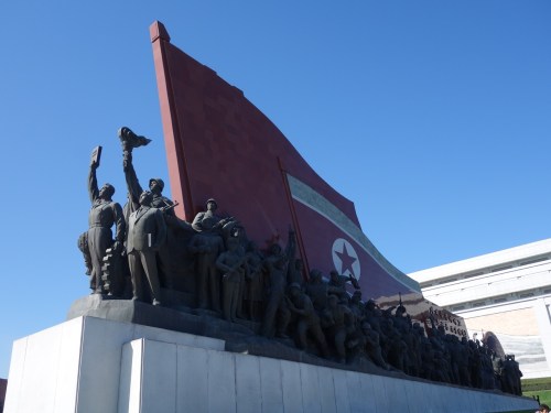 Their portraits adorn every public building and public space. Strangely I think this constant exposure has a bit of a weird effect as I found myself developing warm feelings towards the smiling heads everywhere. I’m sure there is something in the psychology which is entirely deliberate. In any case, we purchased some flowers from a nearby stall and continued on to the enormous monument nearby celebrating the successes and conquests of the DPRK and their leaders.