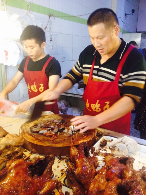 Contrary, to previous trips, by the time we left the Big Buddha we still had ages to get back to Chengdu, so “we” decided to check out a crispy duck emporium raved about in Lonely Planet. Sarah the veggie was delighted at this development, and skulked off to find suitable sustenance whilst I engaged with the duckmaster, selecting a suitably large chunk for lunch, which was swiftly shredded into small pieces within a reassuringly weighty bag. My sign language requests for chopsticks fell initially on deaf ears however once they realised I was intending to gorge on the ducky goodness in the street the owner’s son ran over with some disposable plastic gloves. Ideal! Probably the best, least greasy crispy duck I’ve ever tasted and less than 3 quid for a humungous bag.