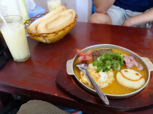 The next day marked Tony’s IELTS speaking test at 2.30pm. We’d been gently practising over the previous day with some general conversation and some ‘targeted’ conversation. The next morning, over a late breakfast, we continued this- And an ace breakfast it was too, not a bad approximation of a “full English” for an entirely Vietnamese dish!