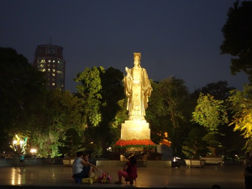 Anyway, I digress. Back out in the evening with Tony and Vinh to have a motorised wander around Hanoi’s lakes and parks. In the second photo you can see a statue of the King who helped to found the first University. As with all open spaces and parks in Vietnam, they are well used by people and the evenings have a real buzz about them with everyone out and socialising, as well as groups of older women energetically dancing to Euro Pop! It’s one way of working out and making friends I suppose.
