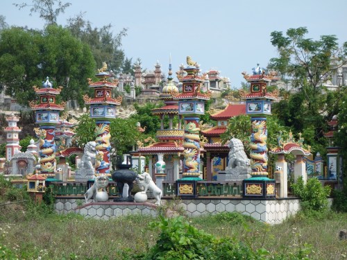 As we got out of the city, the traffic eased considerably, and we turned onto country roads. Out into the real Vietnam, winding our way through bustling local villages. Our first brief stop was at a significant local graveyard, the Hue area is almost unique for its ornate tombs, mainly belonging to well-off local families: