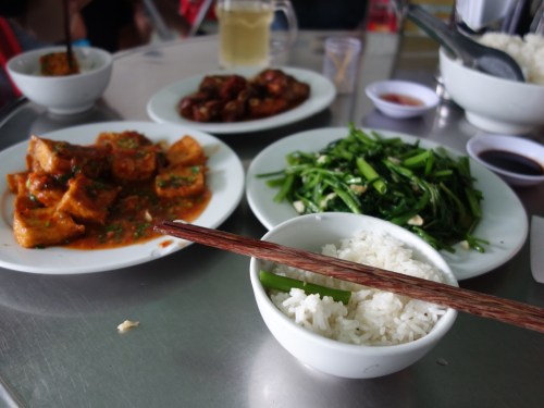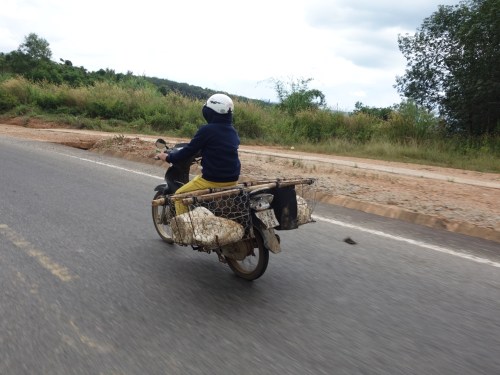 I think that keeping moving is the main technique. Didn’t fancy it myself though. We pushed on and had lunch in a small town close to the Laos border. Good value again for about £3 for both of us, however then disaster struck as Quang broke one of his teeth on a spare rib. The Vietnamese are brilliant at doing the stiff upper lip thing, however he did accept a paracetamol and pledged to get it sorted in the town we were stopping overnight in.