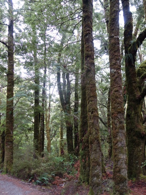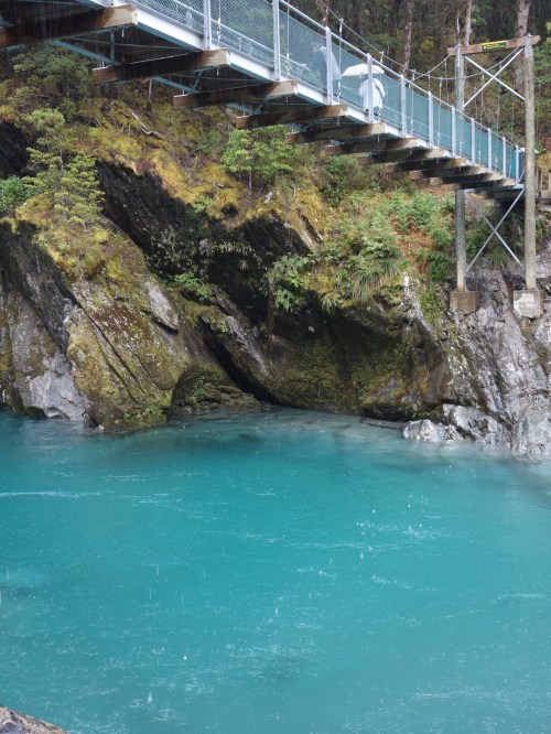 I was enjoying putting in some distance, particularly since the weather outside was appalling, but had to make a stop at the Blue Pools just outside Makarora. I’d been recommended to go there by someone along the way, and upon stopping I found that they were only 15mins walk away through the rain- Another thick, ancient forest to see.