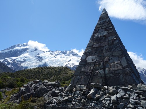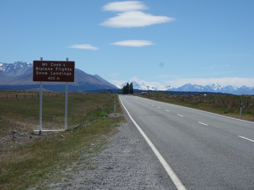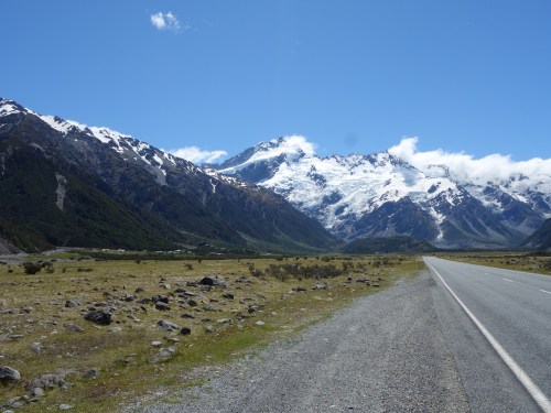 Pretty soon, the imposing figure of Mt Cook/Aoraki again hove into view over the expansive plains. It was strange to be approaching the same mountain from the other side, seeing such different views. And then, the turn-off to Mount Cook village appeared, and the mountain became a constant, glorious sight over the intense blue of Lake Pukaki.