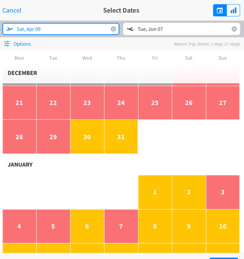 By far my favourite app is Skyscanner, which now has a really user-friendly interface whereby you can bring up a month of departures to find the best price, colour-coded between red yellow and green to determine how cheap it is, relative to the rolling average fare. If you’re flexible on dates, you’re quids-in.