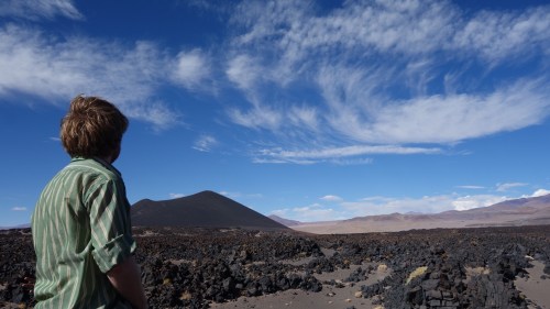 I experienced the strong evolutionary urge that quite often overtakes me in harsh environments like this, every fibre of my being yelling to me that it’s not somewhere I should linger… Very odd. But, upwards we needed to go anyway. The further volcano we had aimed to climb was, by a trick of distance and position, become far far further and so we turned back. Ditching the bikes at the slightly firmer gravel lay by, we struggled up through the soft sand. This was a seriously tough climb!