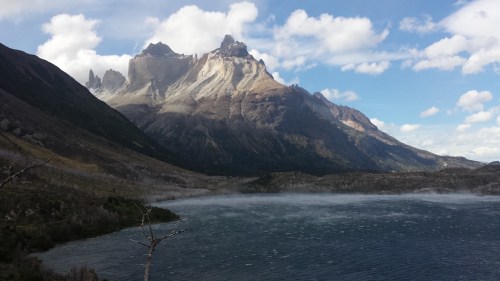 The morning was fine and clear, but before long I emerged onto the exposed trail running alongside the lake towards Campamento Italiano. Here, frequent gusts would announce themselves with a mighty roar down the lake, and the water would then quite literally be lifted a hundred feet into the air and then flung down the valley. Quite incredible, I’ve never seen anything like it- I actually managed in this photo to capture the exact moment the gust hit and knocked the hiker in front of me to her knees!
