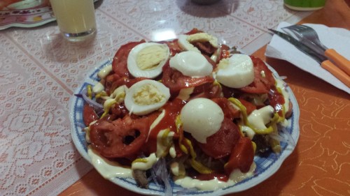 Anne and I then had a somewhat solid journey to get back to San Pedro de Atacama. 4 hours past the blockades, off road and along tracks to reach our first night’s accommodation. With a food stop though, which was ace. I can’t think of the exact name, but this filthy concoction is called something like Pikapaka and is every bit as unhealthy/delicious as it looks.