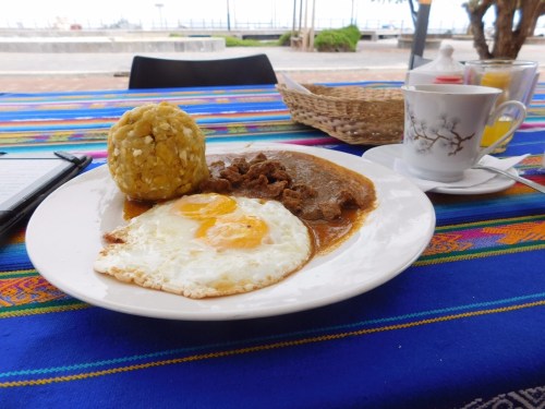 And so, after a final wander around the beach in town it was nearly time to board the boat back to Santa Cruz. A final San Cristobal breakfast, in very traditional style… bolon with meat and egg. The ball is plantain mashed with cheese. A bit boring on its own, but when mixed with meat stew and a bit of hot sauce, it really hits the spot.