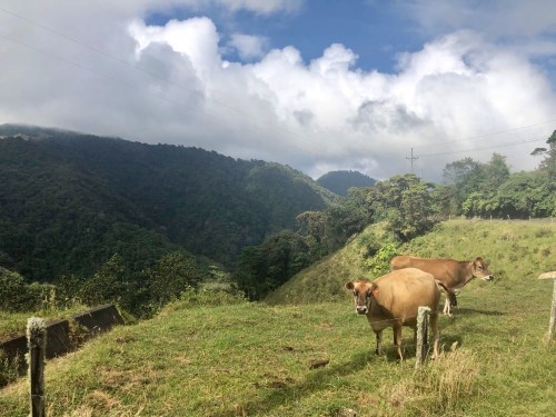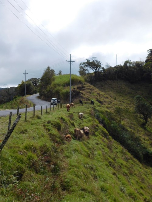 This is quickly confirmed as you wind up into the hills, seemingly endlessly. Fantastic open vistas around every corner, some of the most beautiful countryside we’d seen yet in Costa Rica. In fact, much like highland parts of Panama, it all felt a bit like home- Lush hills, small fields and, bizarrely, loads of Jersey cows!