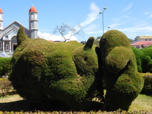 About an hour later than planned we rocked up in Zarcero, famous for its…bushes. A magnificent array of topiary around the church. I was impressed… Some of them were quite obscure, but there was nonetheless a lot of skill involved. The one below definitely has a bit of Botero inspiration.