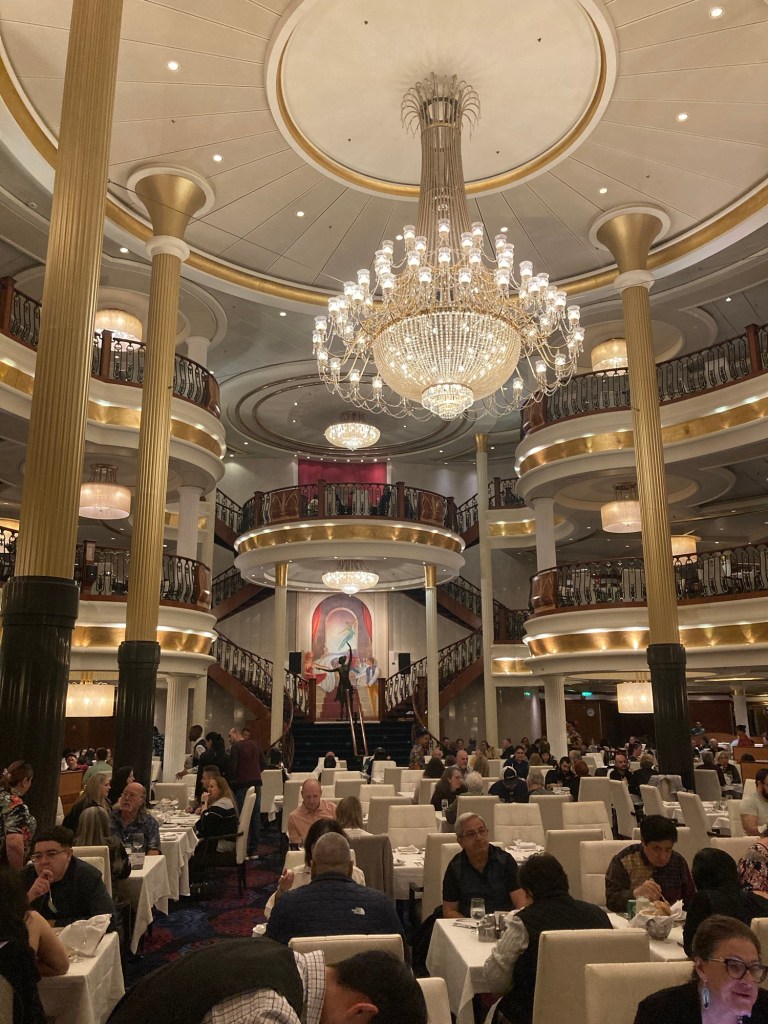 Instead we headed to the Windjammer, this ship’s buffet restaurant, situated at the rear of the ship with panoramic windows. The range and scale of food here is staggering, and the temptation to just have one more course is strong. This was one of the two occasions during our stay that it was an utter zoo- Boarding lunch in particular and breakfasts get seriously busy. To be honest, a little peopley for me and the clientele was, at times a little rustic. Just think big families from flyover states who don’t get out much.