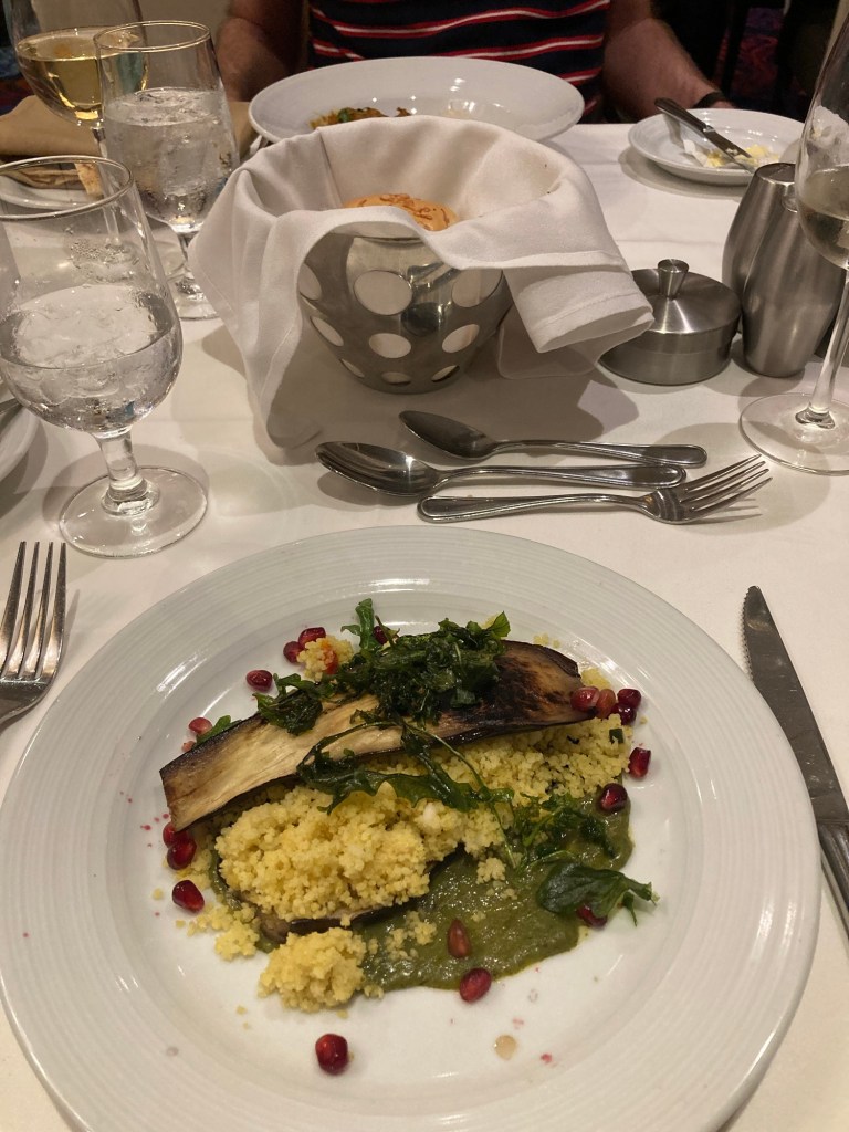 Luckily Mark had been in charge of the booking/organising things so we actually did have evening bookings for the main dining room. You pick your time and, generally, are seated at the same table throughout your cruise. This is a la carte and therefore somewhat less of a zoo than the buffet restaurant. There’s a dress code, but not a particularly strict one.
