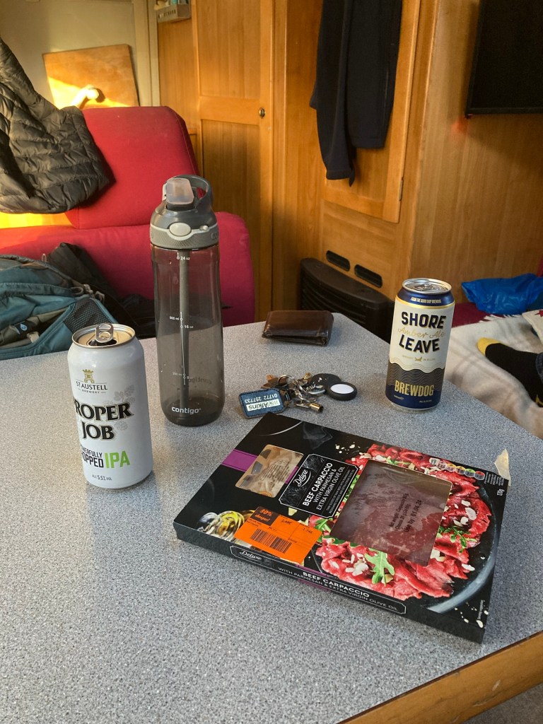 The weather by this point had seriously deteriorated- high winds on the drive up and now biblical rain showers. But we couldn’t just sit in the van all afternoon so turned to Google. The Arvon Ales taproom was a mere 7 minute walk away…mustn’t grumble…after a couple of very decent local pints we dodged the showers back to the van for a makeshift dinner.